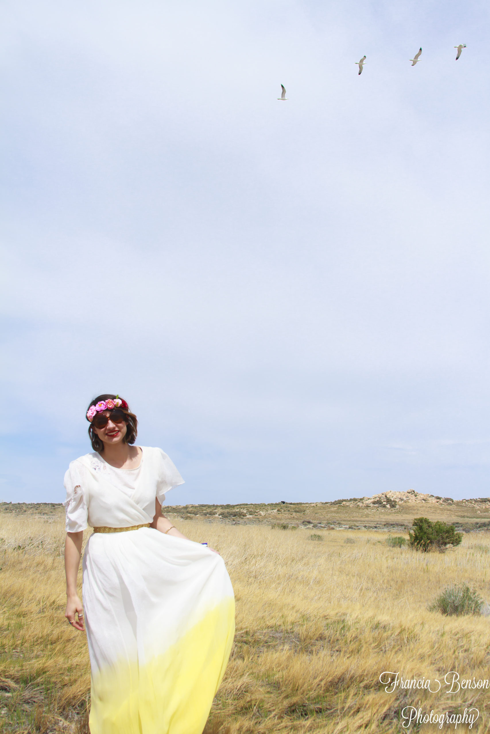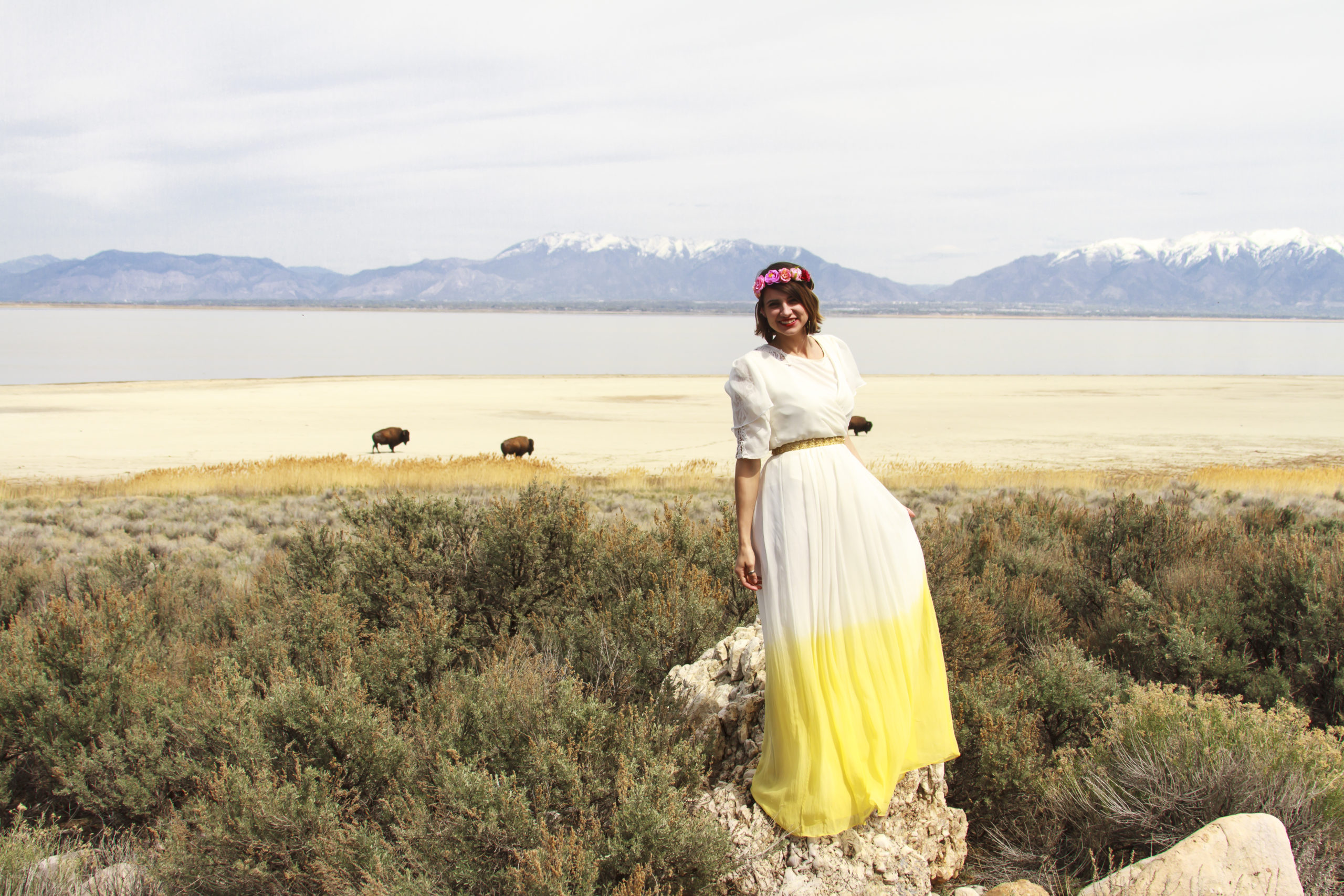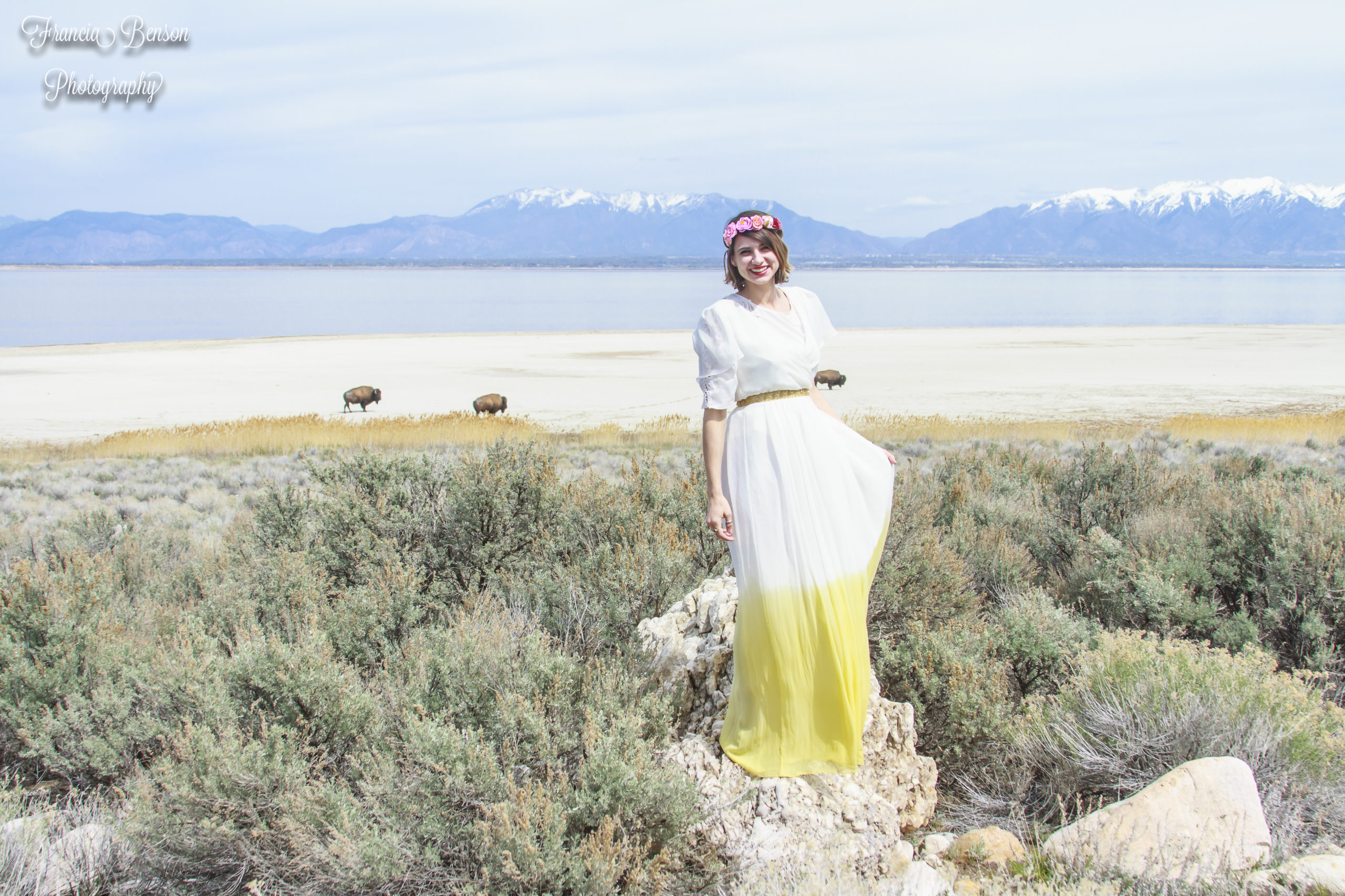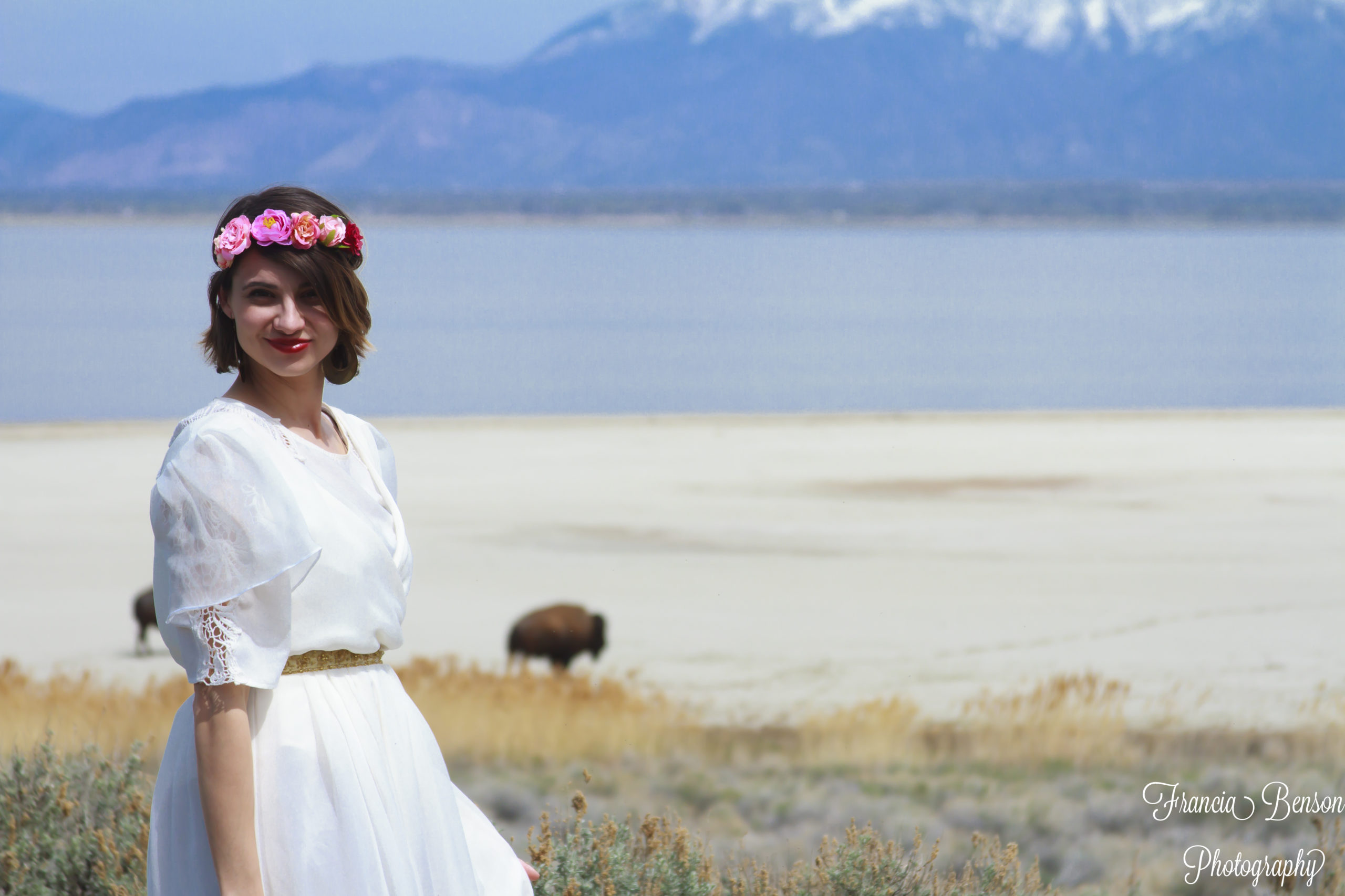 Antelope Island is a magic place. Everything there is so surreal. It has become my garden where I can run freely. My friends, antelopes, buffalos, birds, coyotes, rabbits and I celebrate life together. I decided to open the gates and let this beautiful lady in to play with us. Her beauty and laughter gave confidence to the buffalos and birds, which placed themselves behind her to be part of the image. Enjoy a backdrop of surreal images.