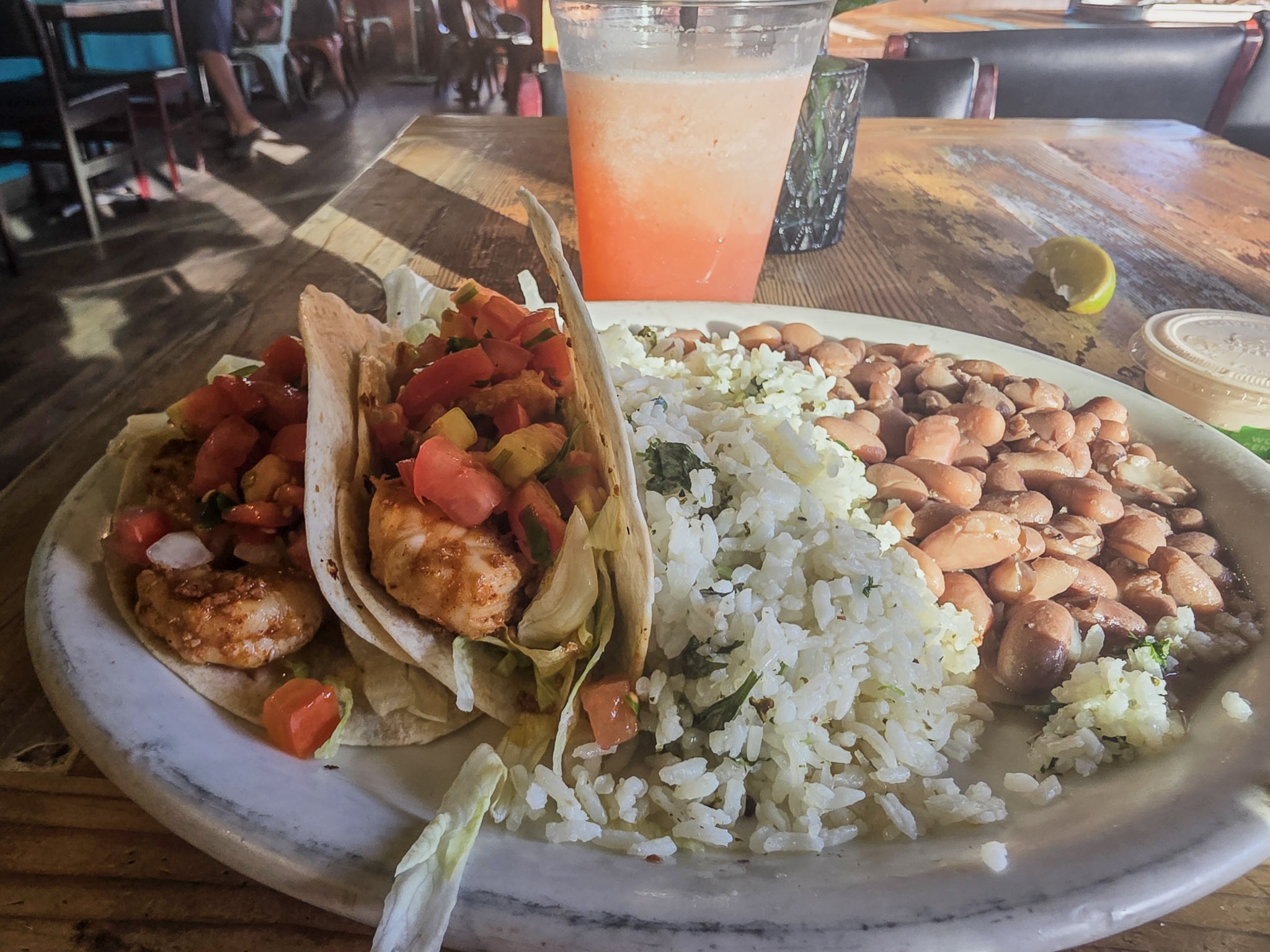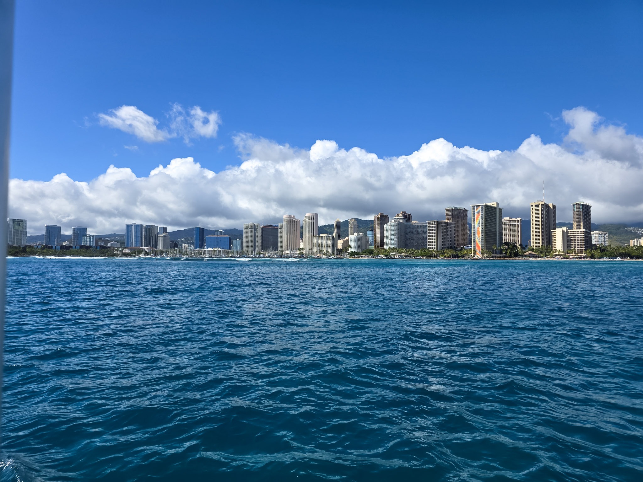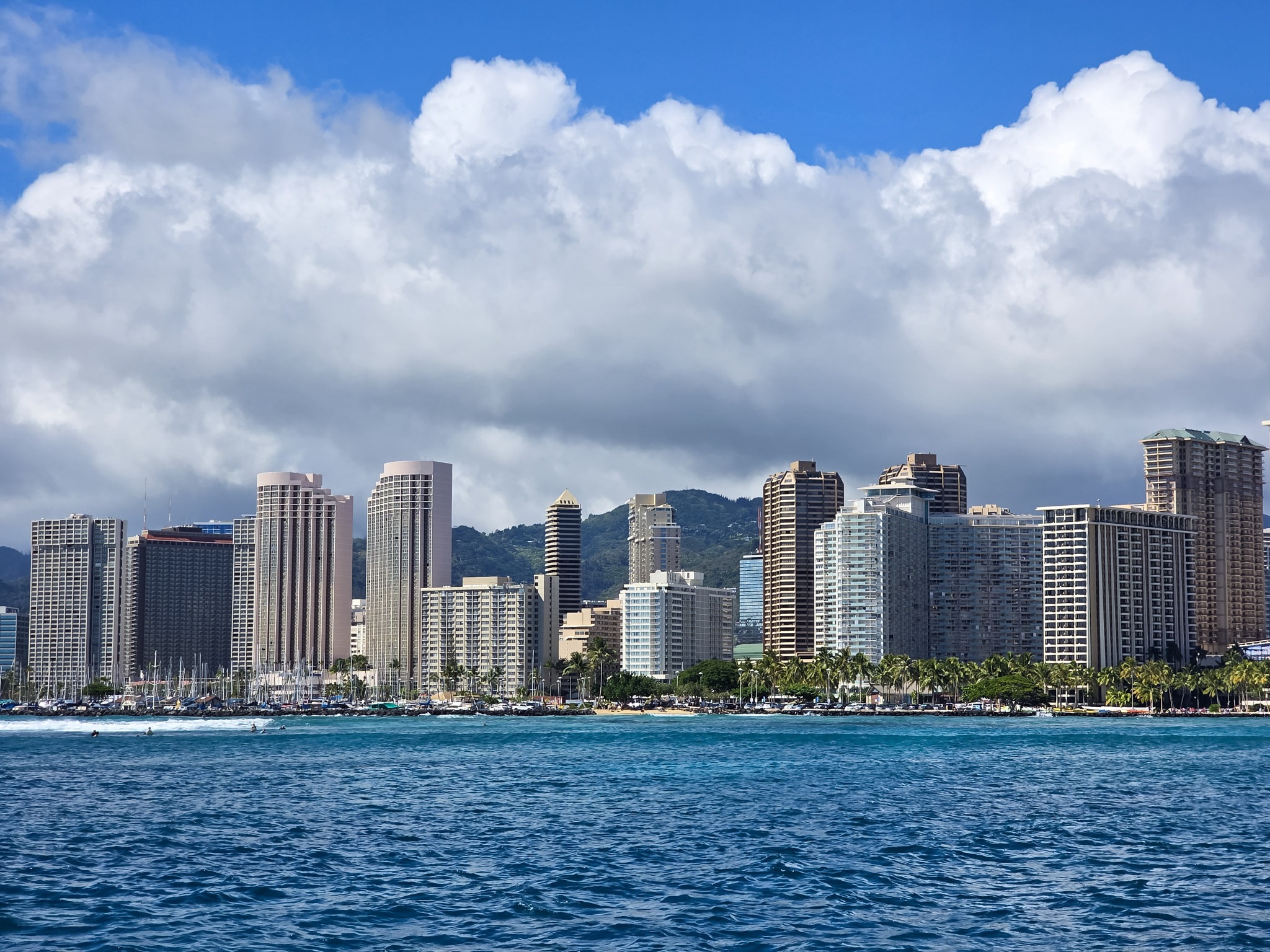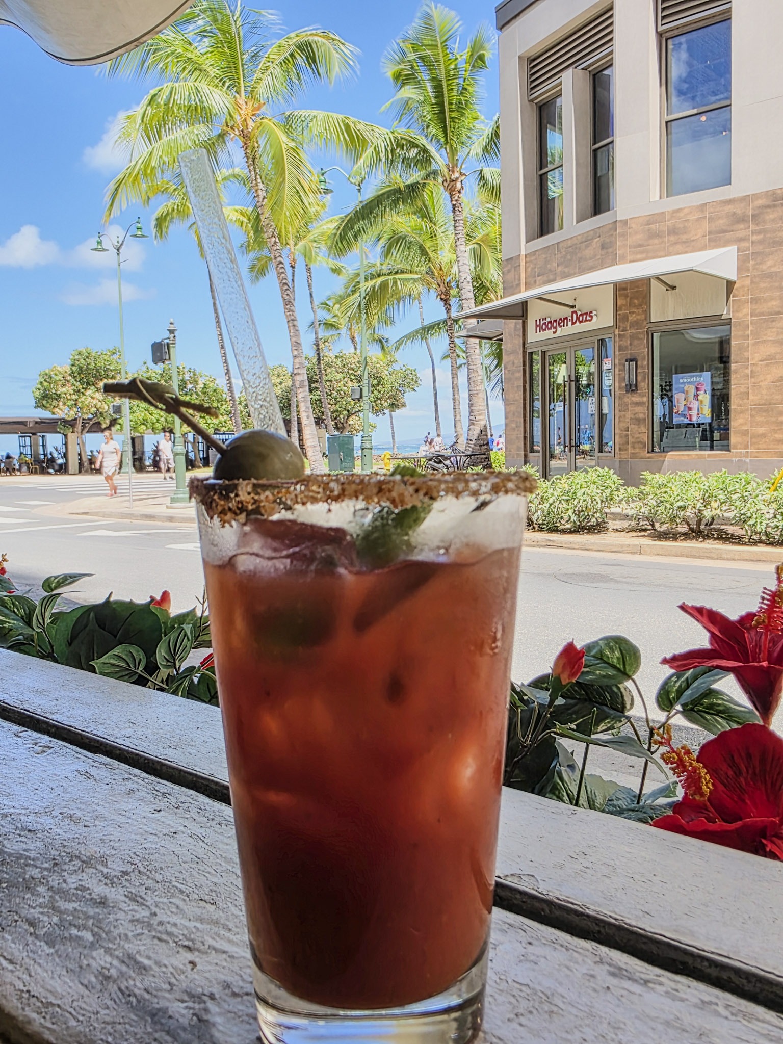 Food and drinks! Shrimp tacos, rice and beans, and a refreshing cocktail welcomed me to Waikiki. In Waikiki, you can go to most places on foot. There are several restaurants, bars, and stores along the streets, and many beachfront properties. The restaurant was located on the second floor, so I took in the beauty of the ocean, the vast green palms, and the people’s happiness from above.